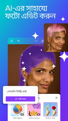 Canva-এর অন্যতম শক্তি নিহিত এর অত্যাধুনিক কৃত্রিম বুদ্ধিমত্তা চালিত কার্যকারিতার মধ্যে, যা আপনার ডিজাইন প্রক্রিয়াকে এক নতুন স্তরে নিয়ে যায়। একটি ছবি আপলোড করলেই এটি আপনার জন্য সেরা ডিজাইন বিন্যাস তৈরি করে দিতে পারে। বিদ্যমান ছবিতে পরিবর্তন আনা বা কিছু যোগ করা এখন আরও সহজ। এমনকি ১০০টিরও বেশি ভাষায় আপনার ডিজাইন স্বয়ংক্রিয়ভাবে অনুবাদ করার ক্ষমতা এর রয়েছে। ম্যাজিক ইরেজারের সাহায্যে ছবির অবাঞ্ছিত অংশ মুছে ফেলুন অনায়াসে, আপনার ভিজ্যুয়ালকে নিখুঁত করে তুলুন। এছাড়া, এর শক্তিশালী ফটো এডিটর দিয়ে ছবি ক্রপ করা, ফ্লিপ করা, উজ্জ্বলতা বা কনট্রাস্ট ঠিক করা থেকে শুরু করে ফিল্টার ও এফেক্ট যোগ করা— সবই সম্ভব। ভিডিও এডিটরে মাত্র কয়েকটি ট্যাপেই পেশাদার মানের ভিডিও তৈরি করুন; লেআউট, অডিও ট্র্যাক, অ্যানিমেশন, ও ট্রানজিশন ব্যবহার করে আপনার গল্পকে জীবন্ত করে তুলুন।