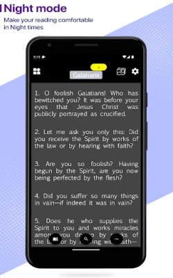 New Revised Asante Twi Bible Apps আপনার ব্যবহারের সুবিধার জন্য কাস্টমাইজেশনের বিস্তৃত বিকল্পও সরবরাহ করে। 'Dark Mode' বৈশিষ্ট্যটি রাতের বেলায় চোখকে আরামদায়ক অভিজ্ঞতা দেয়, যেখানে সাদা টেক্সট কালো ব্যাকগ্রাউন্ডে প্রদর্শিত হয়। আপনি আপনার পছন্দ অনুযায়ী 'Font Settings' থেকে ফন্ট ফ্যামিলি এবং ফন্টের আকার নির্বাচন করতে পারেন। 'Themes' এর মাধ্যমে অ্যাপের সম্পূর্ণ কালার থিম পরিবর্তন করে আপনার রুচি অনুযায়ী সাজিয়ে নিন। প্রতিদিন একটি নির্দিষ্ট সময়ে পবিত্র শ্লোক স্মারক হিসেবে পেতে 'Notification Alarm' সেট করুন। কোনো পরিবর্তন ভুল মনে হলে, 'Reset' বিকল্পটি আপনাকে সহজেই অ্যাপের সেটিংস ডিফল্ট অবস্থায় ফিরিয়ে আনতে সাহায্য করবে।