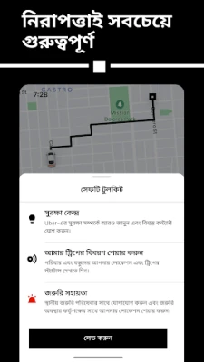 যাত্রী এবং চালক উভয়ের নিরাপত্তাই Uber-এর সর্বোচ্চ অগ্রাধিকার। প্রতিটি Uber Go, Uber Bike বা অন্য যেকোনো Uber রাইডের ক্ষেত্রেই ব্যাপক নিরাপত্তা বৈশিষ্ট্যগুলি স্থাপন করা হয়েছে, যাতে সবাই নিরাপদে এবং স্বাচ্ছন্দ্যে ভ্রমণ করতে পারেন। আমাদের শহরগুলির জন্য একটি টেকসই ভবিষ্যৎ গঠনে Uber প্রতিশ্রুতিবদ্ধ; GO GREEN উদ্যোগের মাধ্যমে আপনি বৈদ্যুতিক ও হাইব্রিড গাড়ির বিকল্প বেছে নিয়ে আপনার কার্বন পদচিহ্ন কমাতে পারেন। ব্যবসা প্রতিষ্ঠানের জন্য Uber for Business একটি বিশেষ ড্যাশবোর্ডের মাধ্যমে ভ্রমণ, খাবার প্রোগ্রাম এবং অন্যান্য সুবিধা ব্যবস্থাপনার সুযোগ দেয়। তাছাড়া, Uber Connect-এর মাধ্যমে প্রিয়জনের কাছে দ্রুত ও যোগাযোগবিহীন প্যাকেজ পাঠানোও এখন সহজ, এবং ট্রানজিট ফিচার আপনার শহরের পাবলিক পরিবহনের পথগুলি সম্পর্কে সঠিক তথ্য প্রদান করে।